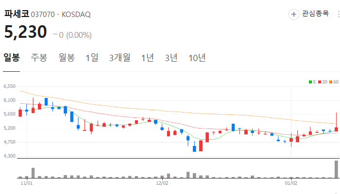 향후 주가 상승이 기대되는 파세코 주가는 2025년 1월 14일 기준 5230원입니다.
