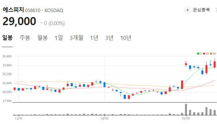 향후 주가 상승이 기대되는 에스피지 주가는 2025년 1월 14일 기준 29000원입니다.