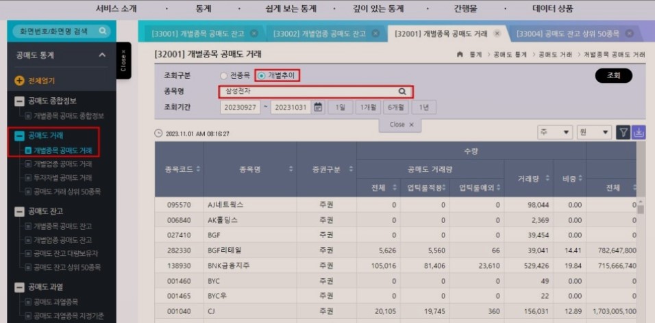 KRX 정보데이터시스템은 해당 데이터를 확인하는 간편한 방법을 제공합니다. "공매도 통계" 섹션에서 개별 종목의 공매도 잔고를 확인할 수 있습니다.