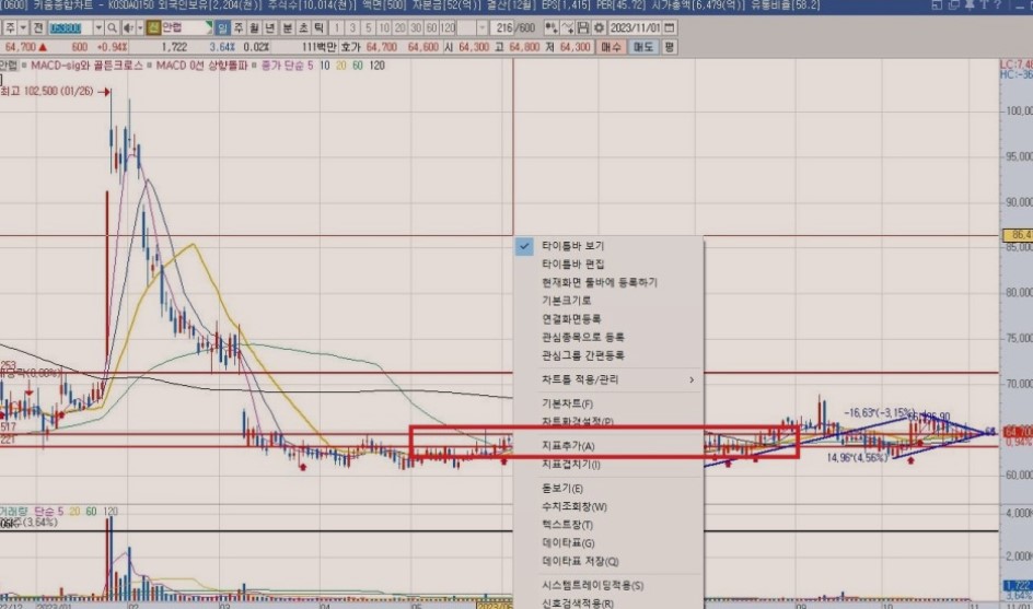 증권사 hts의 종합 차트에서 마우스 오륵쪽 버튼을 클릭하여 "차트 추가"를 선택해 줍니다.