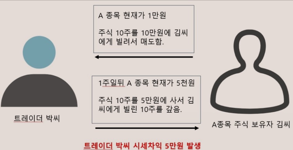 예를 들어, A 트레이더가 B 트레이더로부터 X 회사의 주식 10주를 빌려 매도하고, 주가가 100달러에서 50달러로 하락할 것으로 예상합니다. 주가가 실제로 50달러로 하락하면 A 트레이더는 500달러에 해당 주식을 다시 구매하여 B 트레이더에게 반환하고 500달러의 이익을 얻게 됩니다.