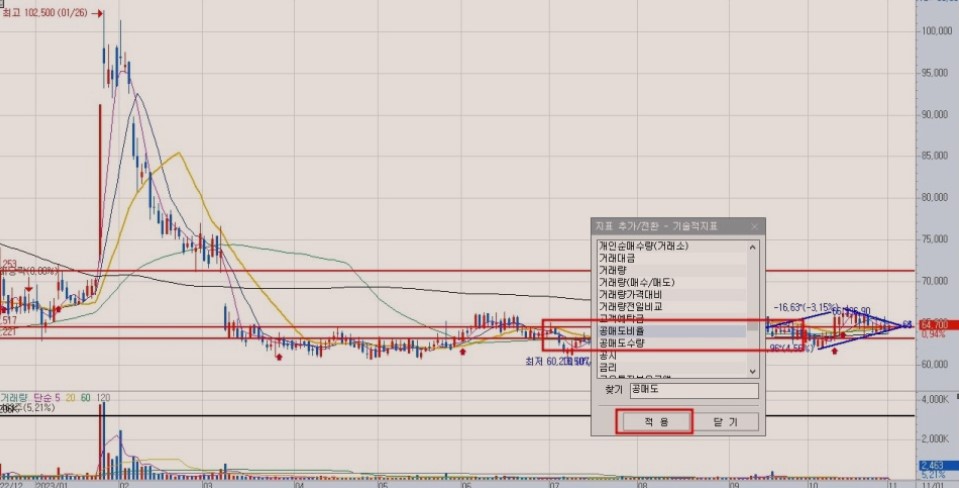 중간의"지표 추가:를 누르고 각종 기술적 지표 중 "공매도"라고 입력 하여 해당 지표를 추가해 줍니다.