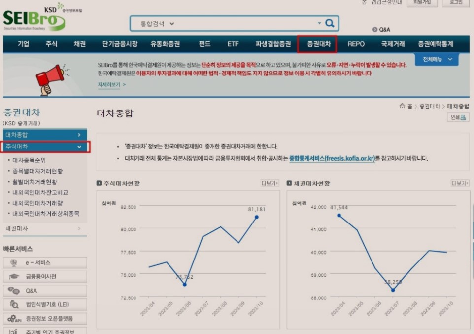 SEIBRO는 주식 대차 거래 정보를 제공하는 사이트입니다. "증권 대차" 섹션에서 종목별 대차 거래현황을 확인할 수 있습니다.