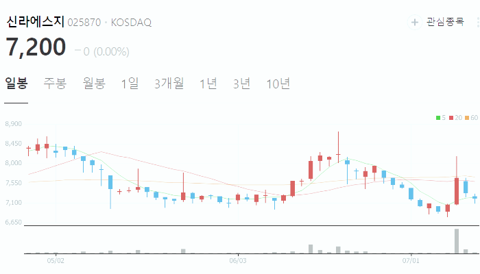 7월11일 기준 신라에스지 주가는 7200원입니다.