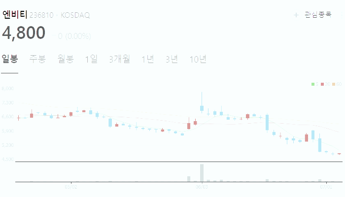 7월4일 기준 엔비티 주가는 4800원입니다. 아래에서 이 글을 읽고 있는 순간 엔비티 주가 추세를 확인해 보세요.