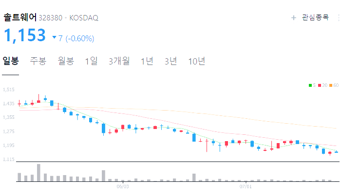 7월20일 기준 솔트웨어 주가는 1153원입니다.
