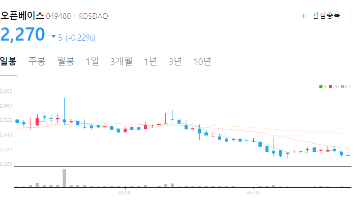 7월20일 기준 오픈베이스 주가는 2270원입니다.