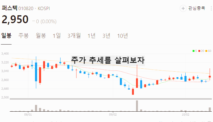 향후 주가 상승이 기대되는 퍼스텍 주가는 2024년 10월 15일 기준 2950원입니다.