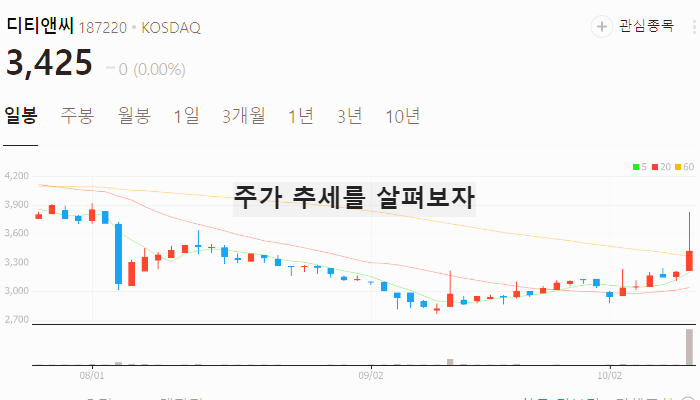 향후 주가 상승이 기대되는 디티앤씨 주가는 2024년 10월 15일 기준 3425원입니다.