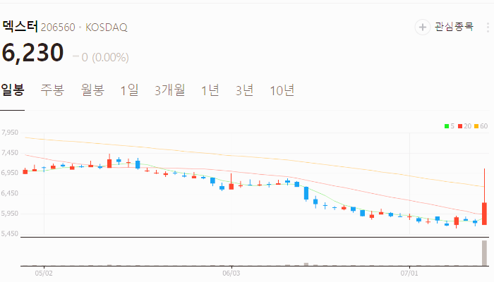 7월12일 기준 덱스터 주가는 6230원입니다.