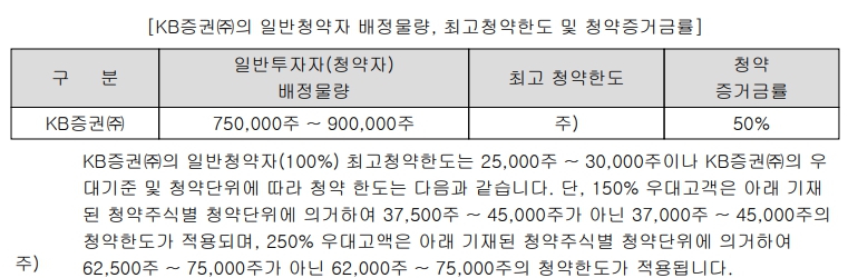 KB증권은 일반 청약자에게 750,000주부터 900,000주까지의 배정을 할 예정이며, 일반 청약자는 25,000주부터 30,000주까지, 우대 그룹은 30,500주부터 75,000주까지 청약이 가능합니다. 청약 증거금률은 50%입니다.