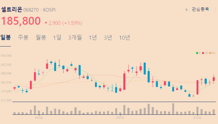 7월06일 기준 셀트리온 주가는 185800원입니다.