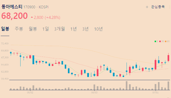 7월06일 기준 동아에스티 주가는 68200원입니다.