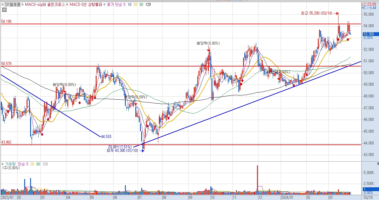올해 지속적인 실적 회복세를 유지한다면 해당 우상향 추세선을 유지할 가능성이 높다고 SK텔레콤 주가 전망을 해볼 수 있습니다.