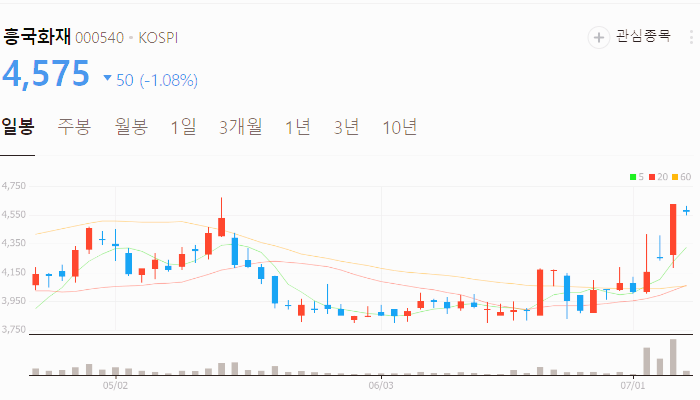 오늘 기준 흥국화재 주가는 4575원입니다. 아래에서 이 글을 읽고 있는 순간 흥국화재 주가 추세를 확인해 보세요.