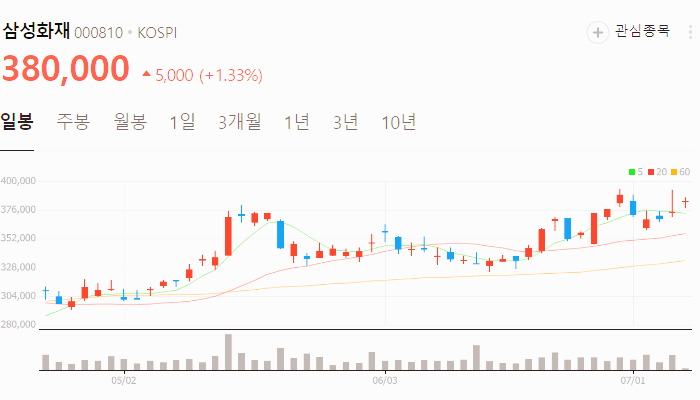 오늘 기준 삼성화재주가는 380000원입니다. 아래에서 이 글을 읽고 있는 순간 삼성화재 주가 추세를 확인해 보세요.