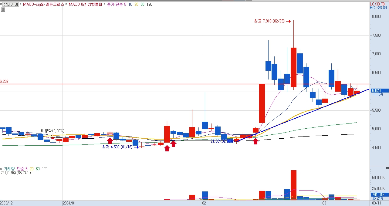 유비케어 일봉 차트를 살펴 보면 2023년 2월 부터 비대면 관련주로 큰 주가 상승을 보여주고 있는 모습입니다.