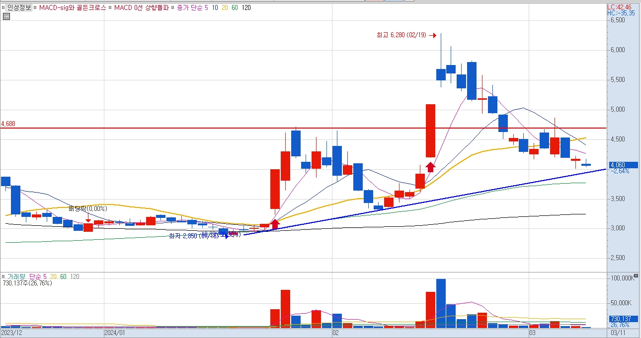 당시 3000원이 었던 인성정보 주가는 6280원을 기록후 단기 조정 장세에 있는데 거래량이 확실히 죽은 모습으로 현재 주가인 4000원 부근에서 눌림목 매매를 해보기 좋은 위치로 보입니다.