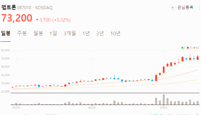 현재 펩트론의 주가는 73200원이며, 시가총액은 약 1조 5121억 원입니다.