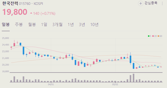 5월 27일 기준 한국전력 주가는 19800원 입니다. 아래에서 이글을 읽고 있는 순간 한국전력 주가 추세를 확인해 보세요.