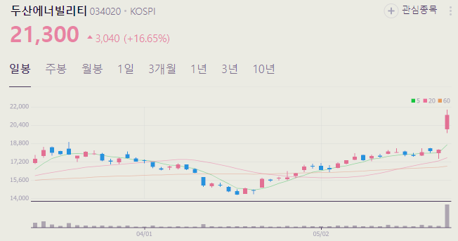 5월 27일 기준 두산에너빌리티 주가는 21300원 입니다. 아래에서 이글을 읽고 있는 순간 두산에너빌리티 주가 추세를 확인해 보세요.