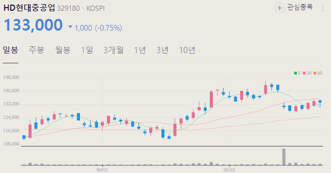 5월 27일 기준 현대중공업 주가는 133000원 입니다. 아래에서 이글을 읽고 있는 순간 현대중공업 주가 추세를 확인해 보세요.