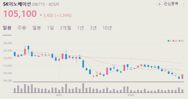 5월 27일 기준 SK이노베이션 주가는 105100원 입니다. 아래에서 이글을 읽고 있는 순간 SK이노베이션 주가 추세를 확인해 보세요.