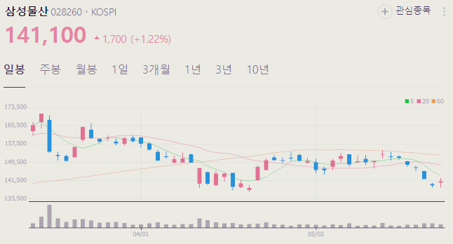 5월 27일 기준 삼성물산 주가는 14100원 입니다. 아래에서 이글을 읽고 있는 순간삼성물산 주가 추세를 확인해 보세요.