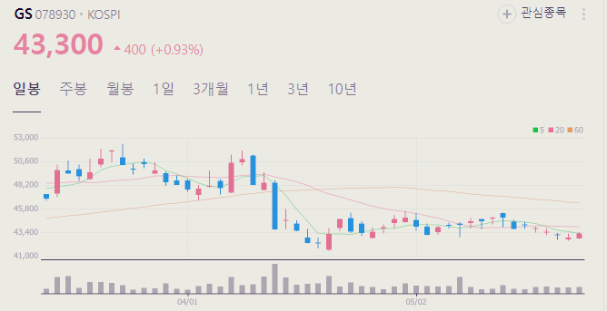 5월 27일 기준 GS 주가는 43300원 입니다. 아래에서 이글을 읽고 있는 순간 GS 주가 추세를 확인해 보세요.
