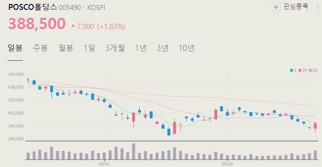 5월 27일 기준 POSCO홀딩스 주가는 388500원 입니다. 아래에서 이글을 읽고 있는 순간 POSCO홀딩스 주가 추세를 확인해 보세요.