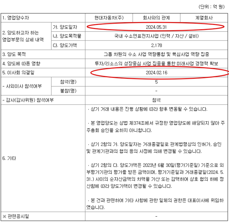 양수양도 계약은 그룹 차원의 수소 사업 역량 통합 및 핵심 사업 역량 집중을 목적으로 양도일자는 2024년 5월 31일로 정해졌으며, 국내 수소연료전지 사업의 인력, 자산, 설비를 모두 현대차에 넘기는 조건으로 이뤄졌습니다.