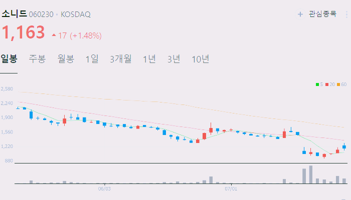 7월24일 기준 소니드 주가는 1163원입니다.