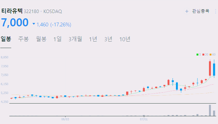 7월24일 기준 티라유텍 주가는 7000원입니다.