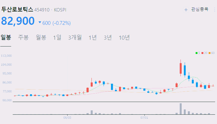 7월24일 기준 두산로보틱스 주가는 82900원입니다.