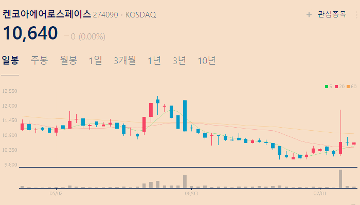7월9일 기준 켄코아에어로스페이스 주가는 10640원입니다.