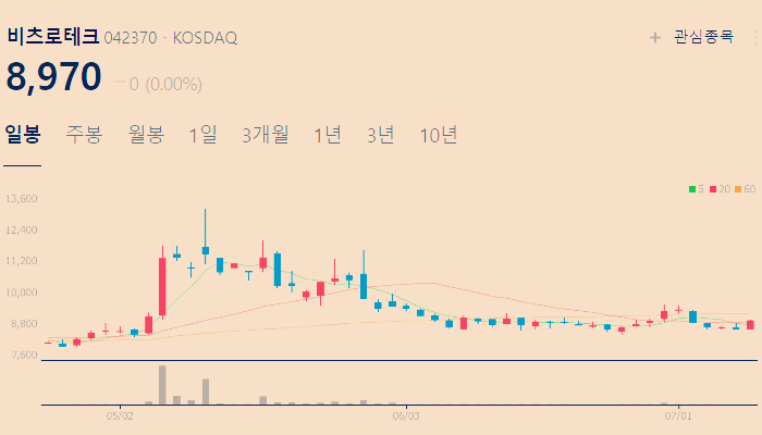 7월9일 기준 비츠로테크 주가는 8970원입니다.