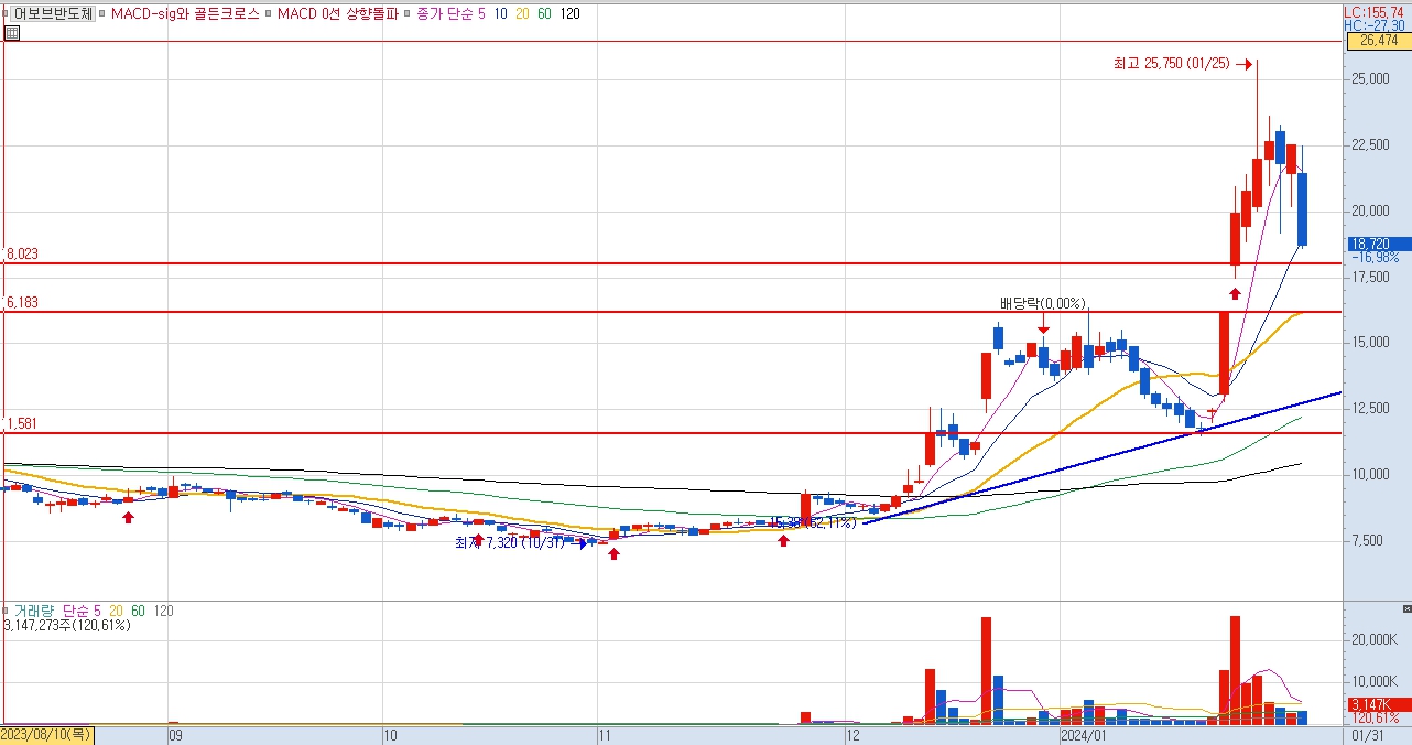 아래에서 대표적으로 시스템반도체 대장주 어보브반도체에 대한 기술적 차트 분석을 이어가겠습니다.
