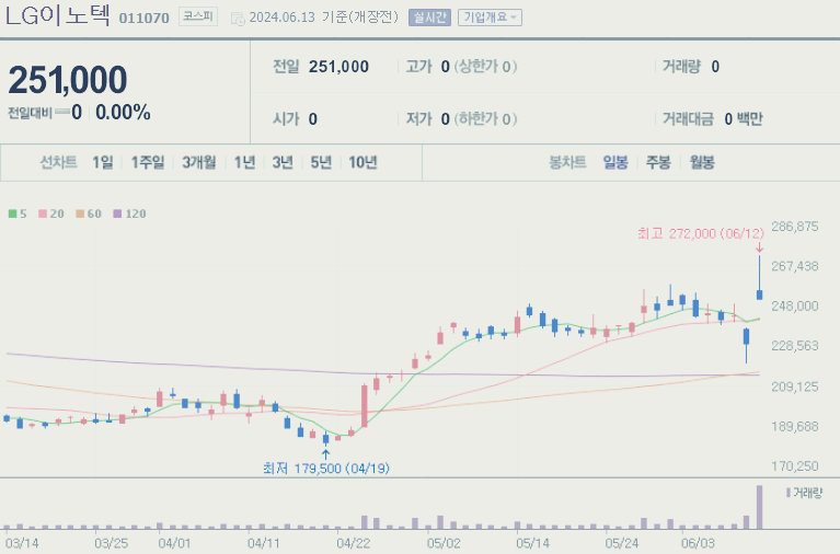 현재 주가 변동성이 큰 LG이노텍 주가는 251000원 입니다. 지금 이 글을 읽고 있는 순간 LG이노텍 주가 추세를 확인해보세요.