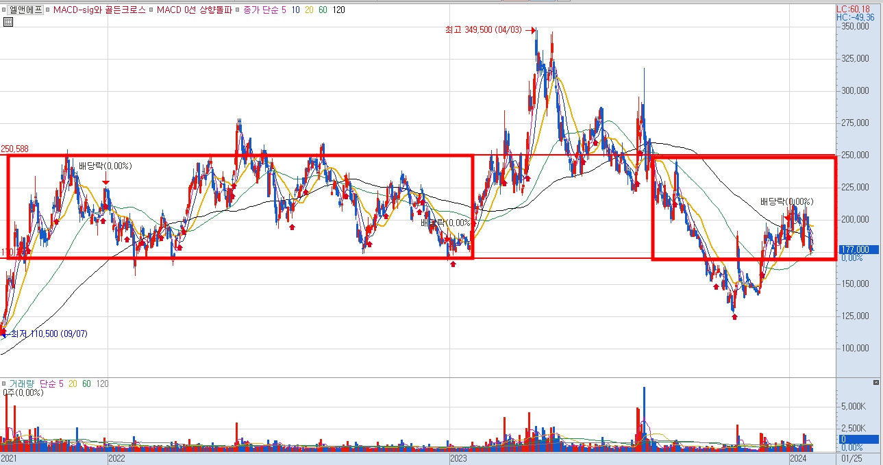장기적으로 엘앤에프 주가는 2021년 고점을 찍은 이후 고점 박스를 벗어나지 못하고 있습니다.