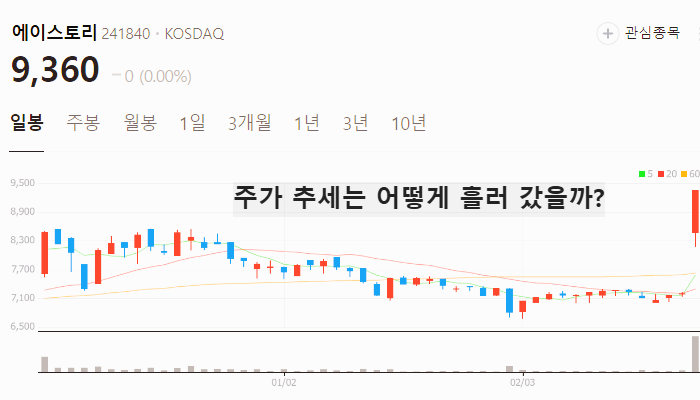 아래에서 그 동안 에이스토리 주가 추세가 어떻게 흘러갔는지 확인해보세요.