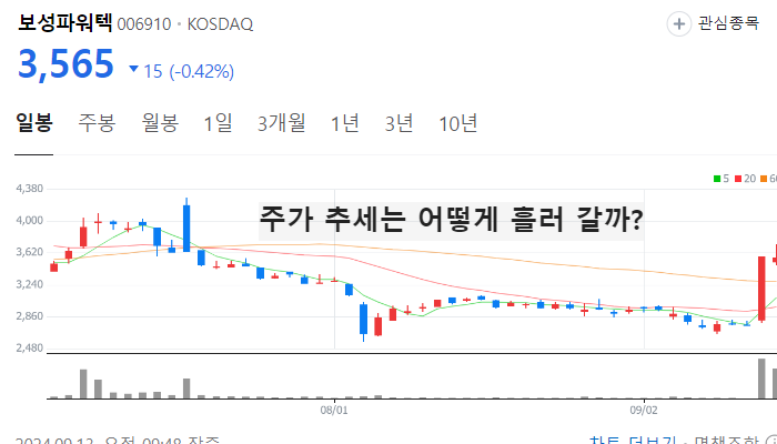 주가 상승이 기대되는 보성파워텍 주가는 2024년 9월 13일 기준 3565원입니다.