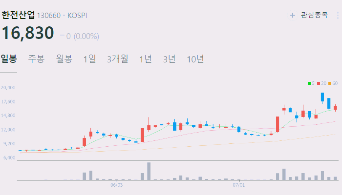 7월23일 기준 한전산업 주가는 16830원입니다.