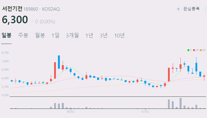 7월23일 기준 서전기전 주가는 6300원입니다.