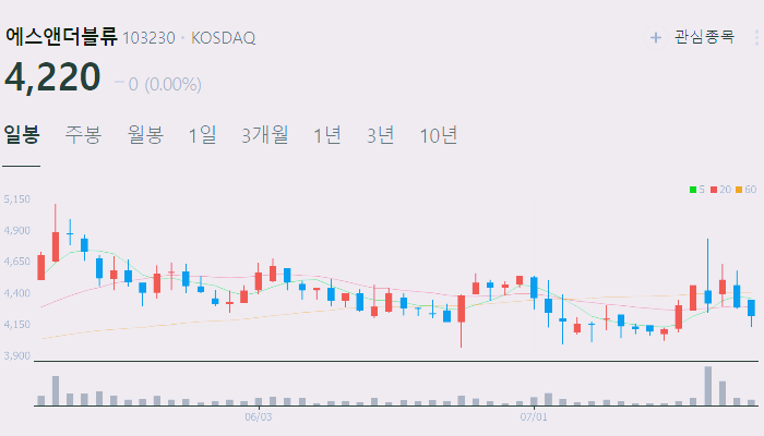 7월23일 기준 에스앤더블류 주가는 4220원입니다.