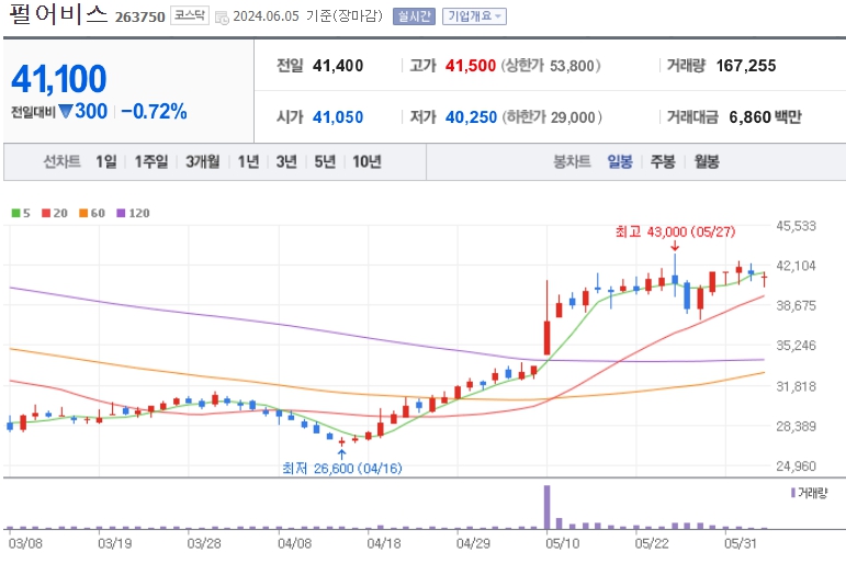 6월 6일 펄어비스 주가는 41100원입니다. 아래에서 이 글을 읽고 있는 순간 펄어비스 주가 추세를 확인해 보세요.