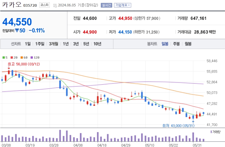 6월 6일 기준 카카오 주가는 44550원 입니다. 아래에서 이 글을 읽고 있는 순간 카카오 주가 추세를 확인해 보세요.