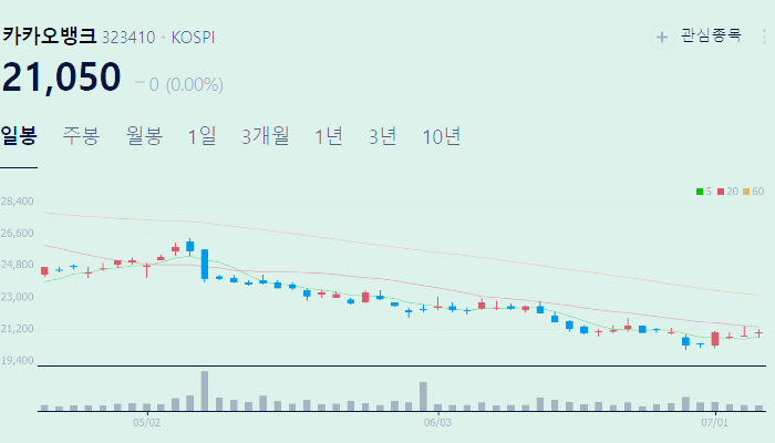 7월5일 기준 카카오뱅크 주가는 21050원입니다. 아래에서 이 글을 읽고 있는 순간 카카오뱅크 주가 추세를 확인해 보세요.