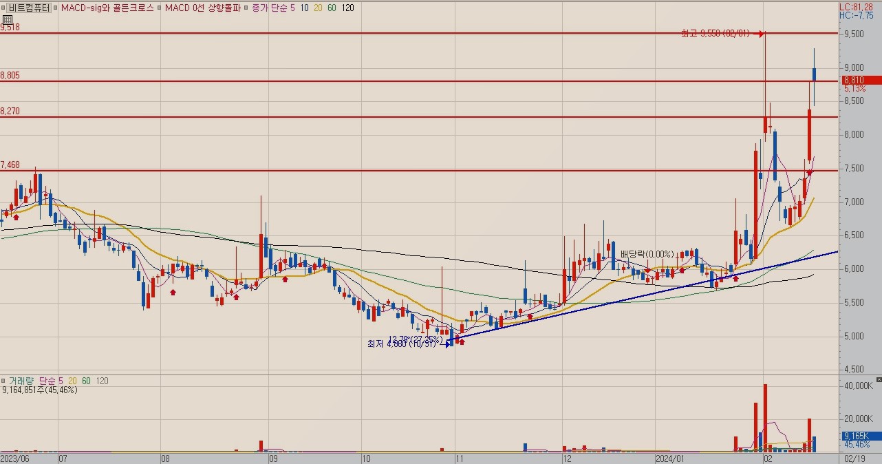 주요 지지선 8200원을 유지하며 지지를 잘 받는다면, 비트컴퓨터 주가는 전 고점인 9550원을 무난하게 돌파할 수 있을 것으로 전망됩니다.