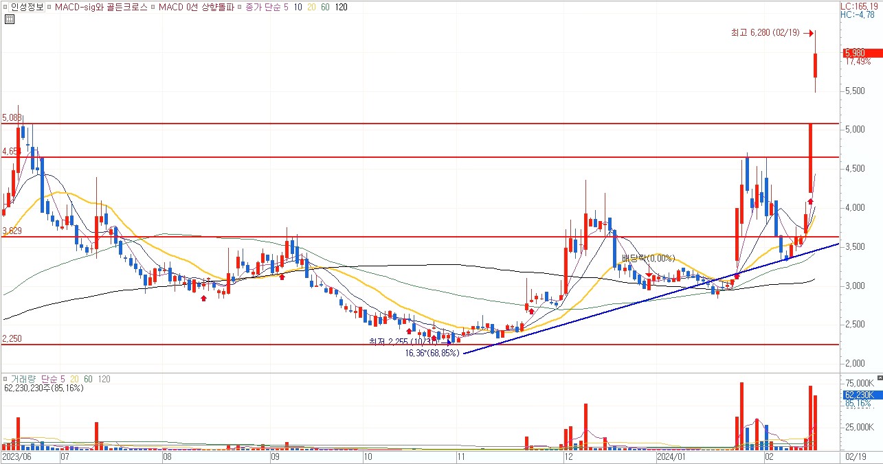 만일 4650원에서 인성정보 주가가 지지를 받고 반등세를 보인다면, 전 고점인 5320원을 무난하게 돌파할 수 있을 것으로 예상되므로, 이러한 움직임을 주시해볼 필요가 있습니다.