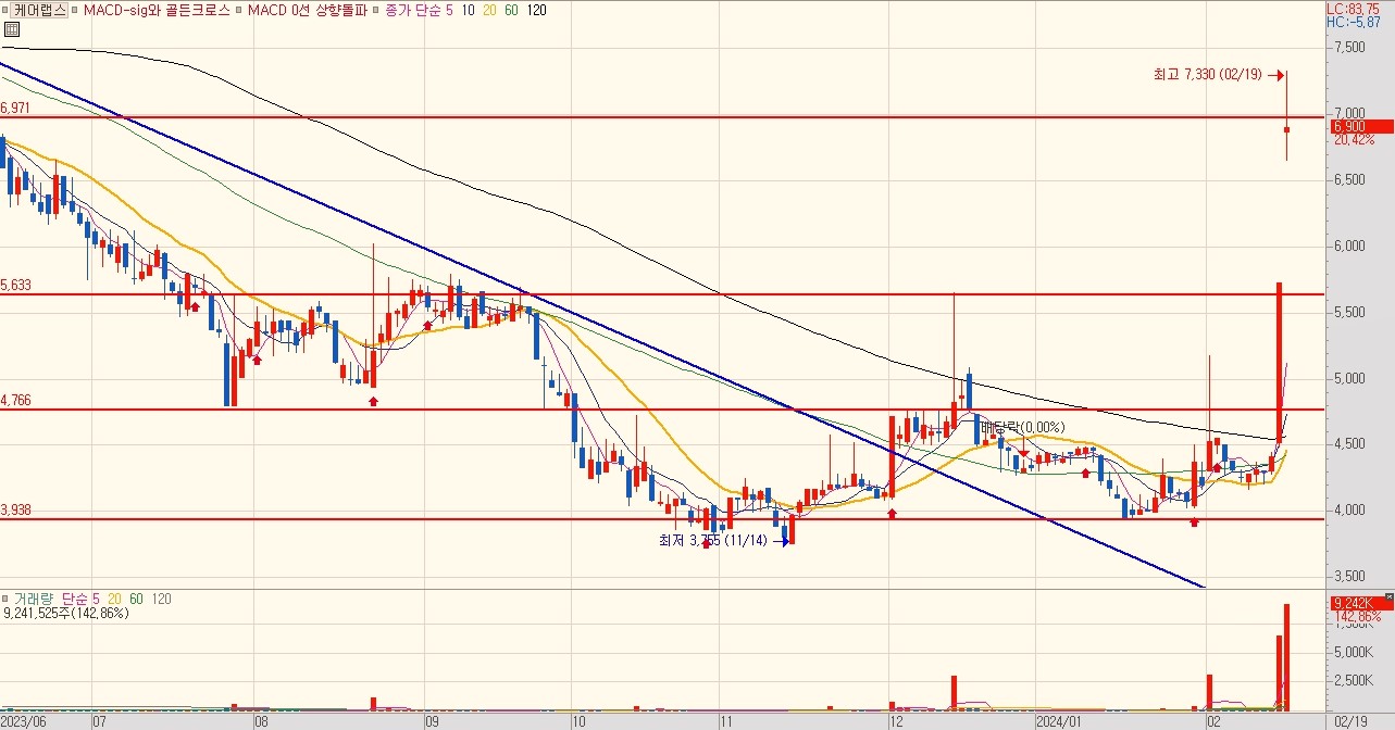 특히 의료대란 관련주로서 주목받고 있으며, 5630원과 4765원 사이에서 신규 공략이 가능할 것으로 판단됩니다.